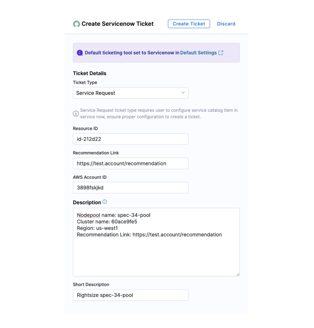 - Implement Changes and Track using Jira/ServiceNow - Apply the optimizations manually in your cloud environment. Create and manage Jira or ServiceNow tickets to monitor implementation progress
