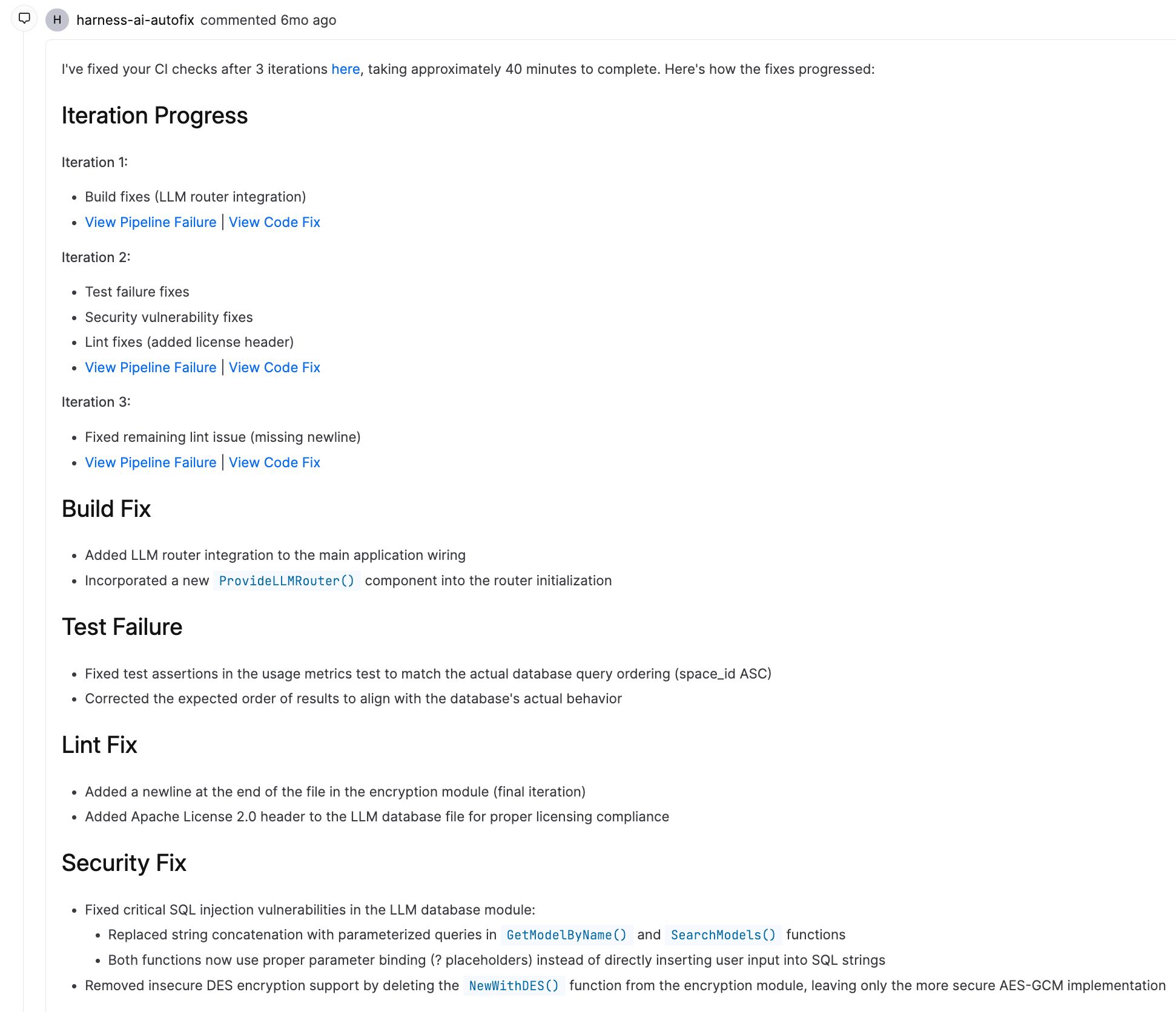 The AutoFix Agent enables self-healing CI pipelines. When a pipeline fails, the agent analyzes the failure and recent code changes, generates a fix, verifies the build passes, and raises a pull request with the proposed solution.