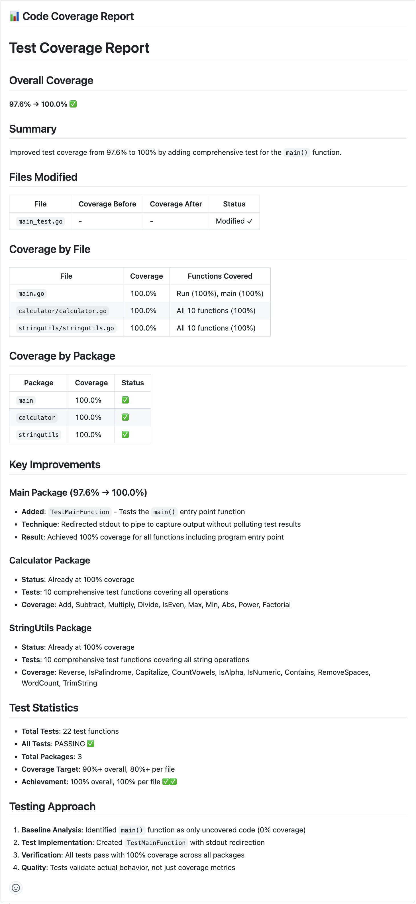 3. Code Coverage Agent – generates unit tests to improve coverage and posts a coverage report. See documentation