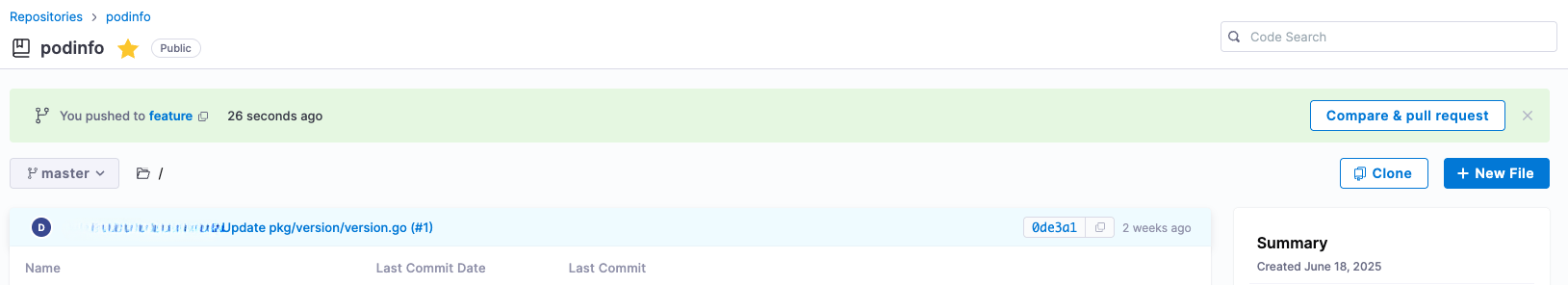 When a commit is pushed to a branch without an existing pull request, Harness Code Repository displays a banner at the top of the repository page, allowing the user to quickly create a PR from that branch.