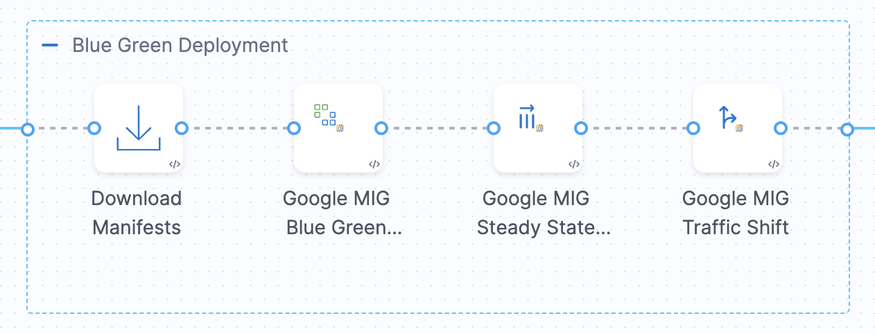 When you select the Blue-Green strategy, Harness automatically configures the Google MIG Blue Green Deploy step group with four essential steps that orchestrate the entire deployment lifecycle: