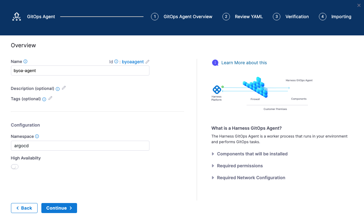 In the Harness GitOps Agent installer, select Continue.