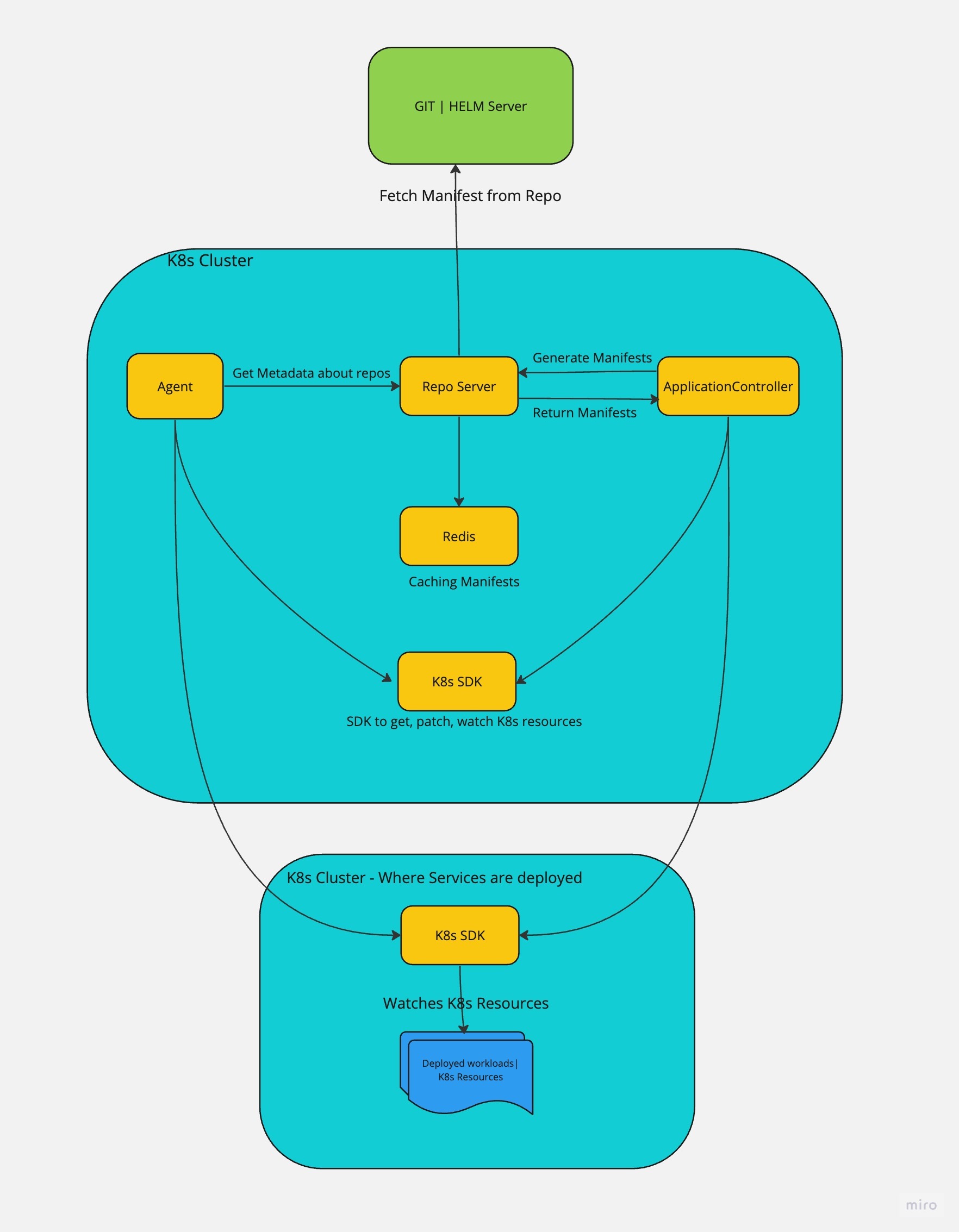 - Applies manifests to target Kubernetes clusters to reconcile desired and live states