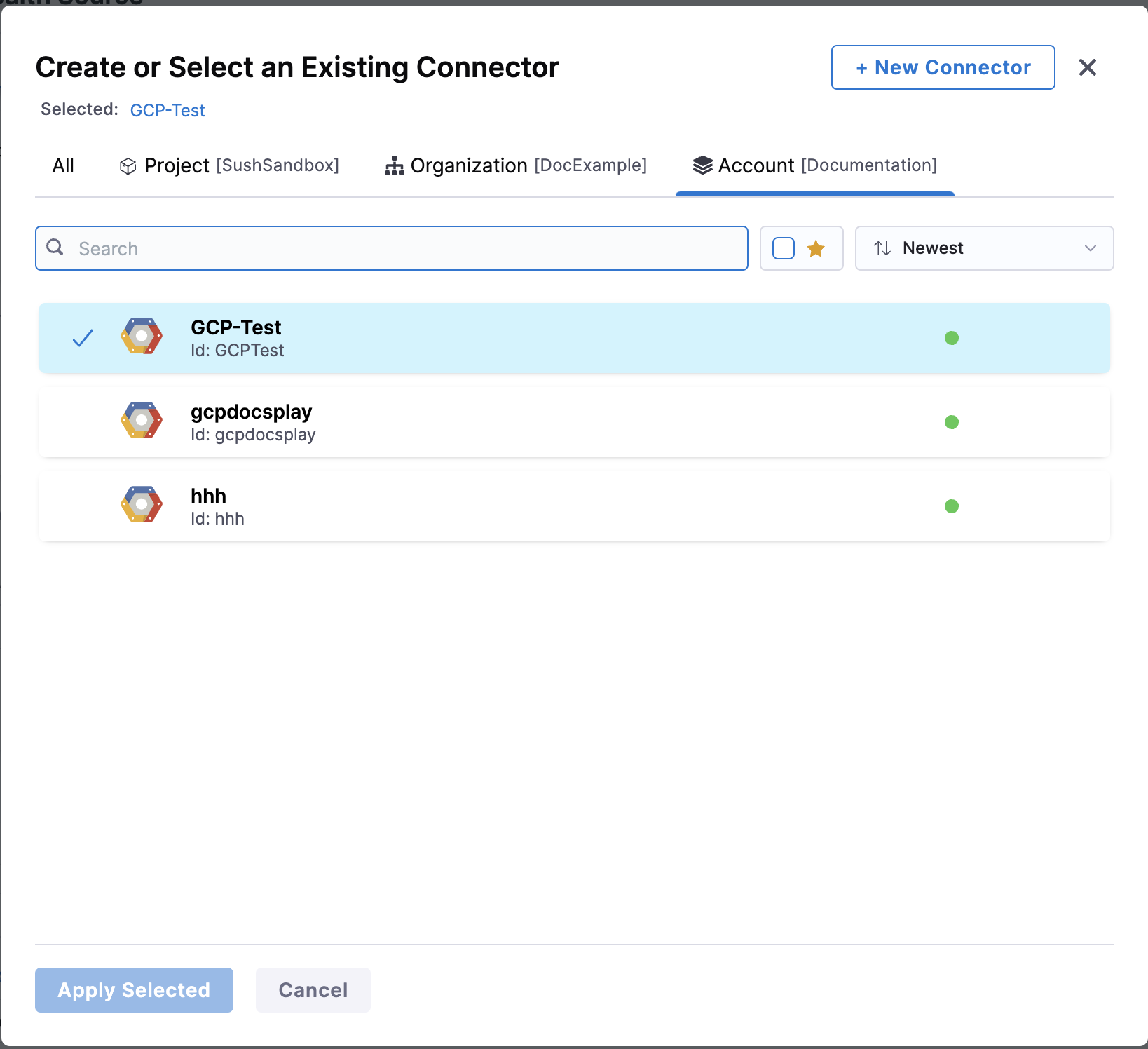In Connector settings, you can either choose an existing connector GCP connector or click New Connector.