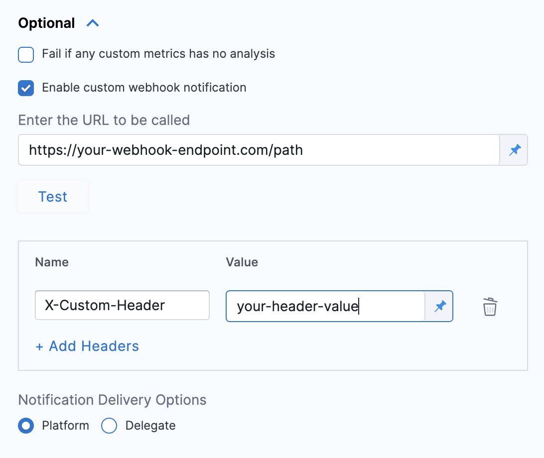 4. (Optional) Add custom headers by clicking + Add Headers and providing name-value pairs.