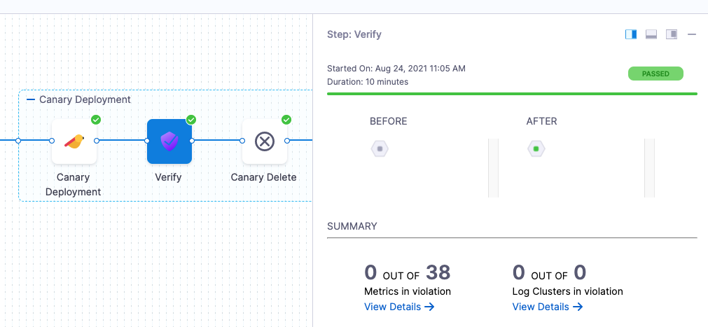 • Harness will automatically add the Verify step. For example, here is a stage where Canary strategy and the Enable Verification option were selected