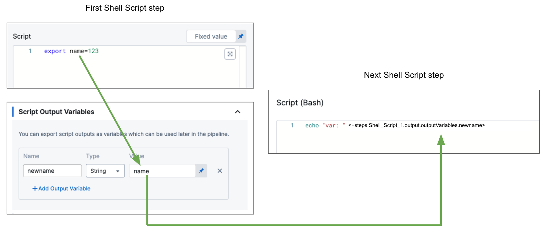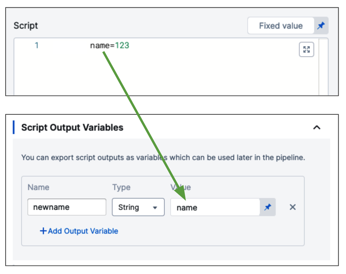 When executing a script, you can also dynamically capture the execution output from the script, providing runtime variables based on the script execution context, and export those to another step in the same stage or another stage in the same pipeline.