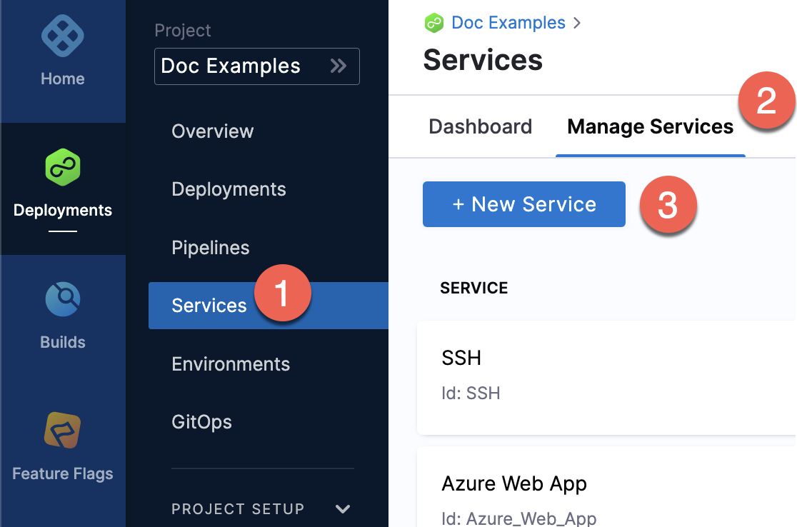 To create a service from inside of a pipeline, select the Services tab of a new CD stage, then select New Service.