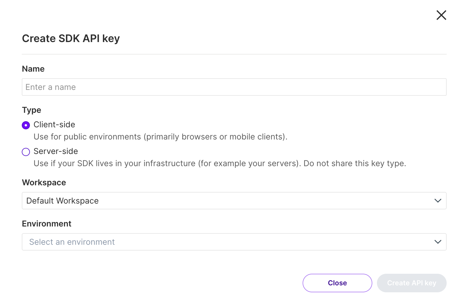 5. Select the type of SDK API key: Client-side or Server-side.