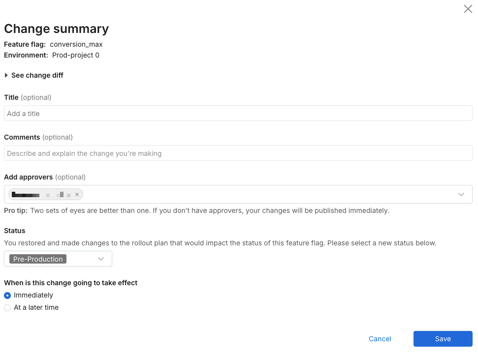 1. After submitting a change to the rollout plan of a feature flag, on the Change summary page, in the Status field, select the desired status, e.g., Internal testing.