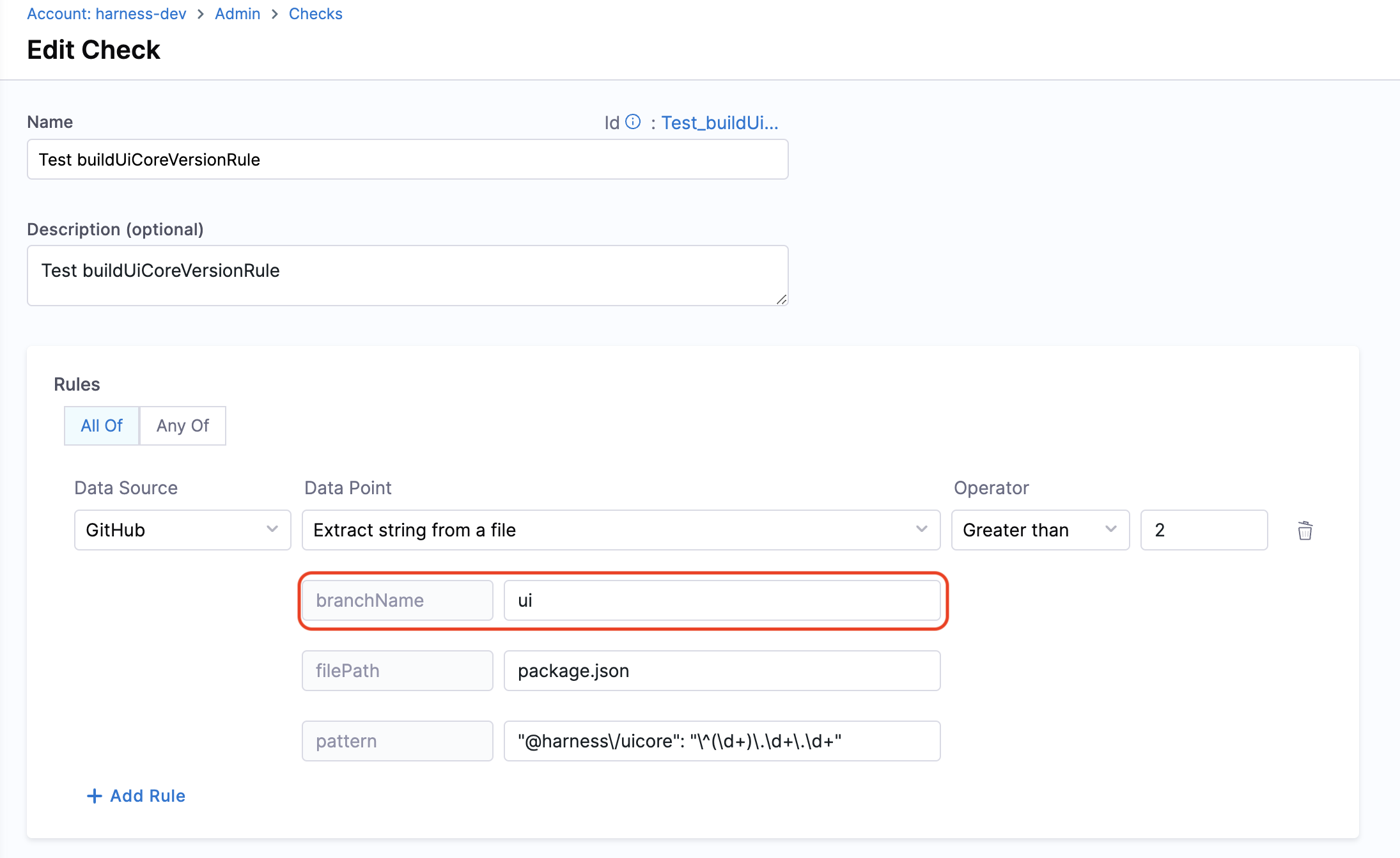 Calculation Method: If a branch name is specified, it is utilized. However, if no branch name is provided, the system retrieves information from the catalog YAML file using the backstage.io/source-location annotation to determine the branch name and repository details. It is essential to specify the filename with its extension or provide the relative path from the root folder (e.g., README.md or docs/README.md) in the conditional input field. After fetching the file, the contents are examined to find the pattern. Returns true/false based on whether the pattern was found or not.