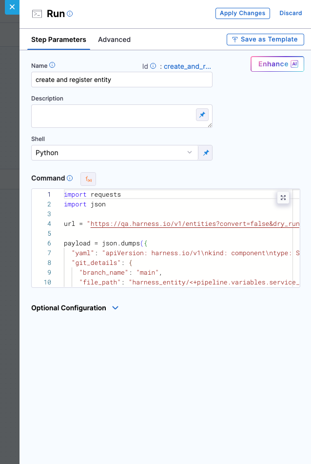 In this section, you’ll set up a Harness pipeline that automates the onboarding of new Java services. This pipeline will take the inputs a developer submits through an IDP Workflow form, generate a service using a cookiecutter template, push it to GitHub, and register it in the IDP Software Catalog.
