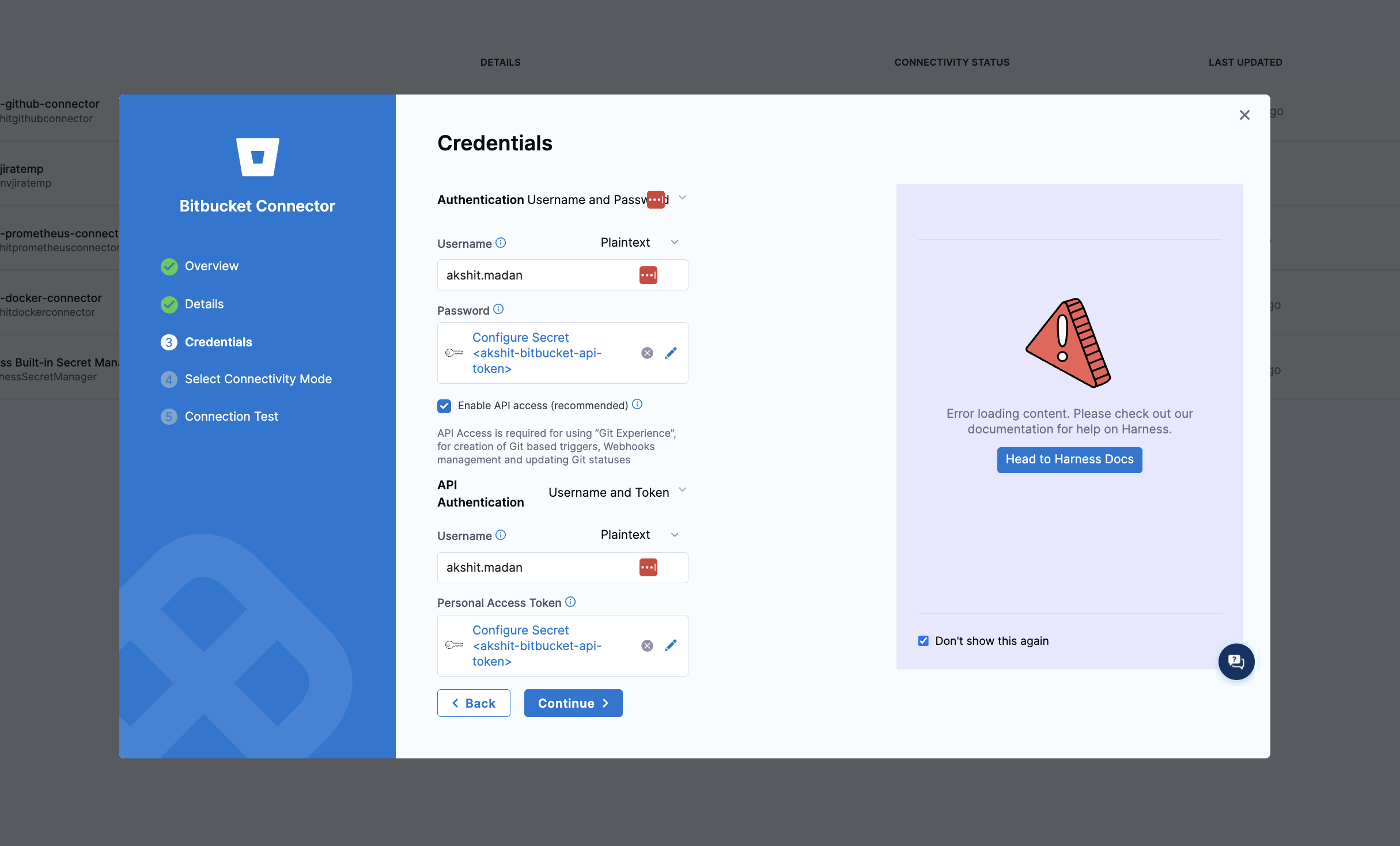 In the Username field, enter your Bitbucket account username. You can find your username in your Bitbucket Account settings. You can use either plaintext or a Harness encrypted text secret.