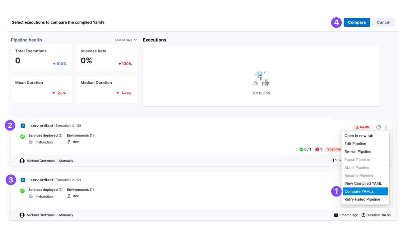 - Go to your pipeline, select Execution History, select More Options (⋮), and then select Compare YAML or Compare Pipeline Executions.