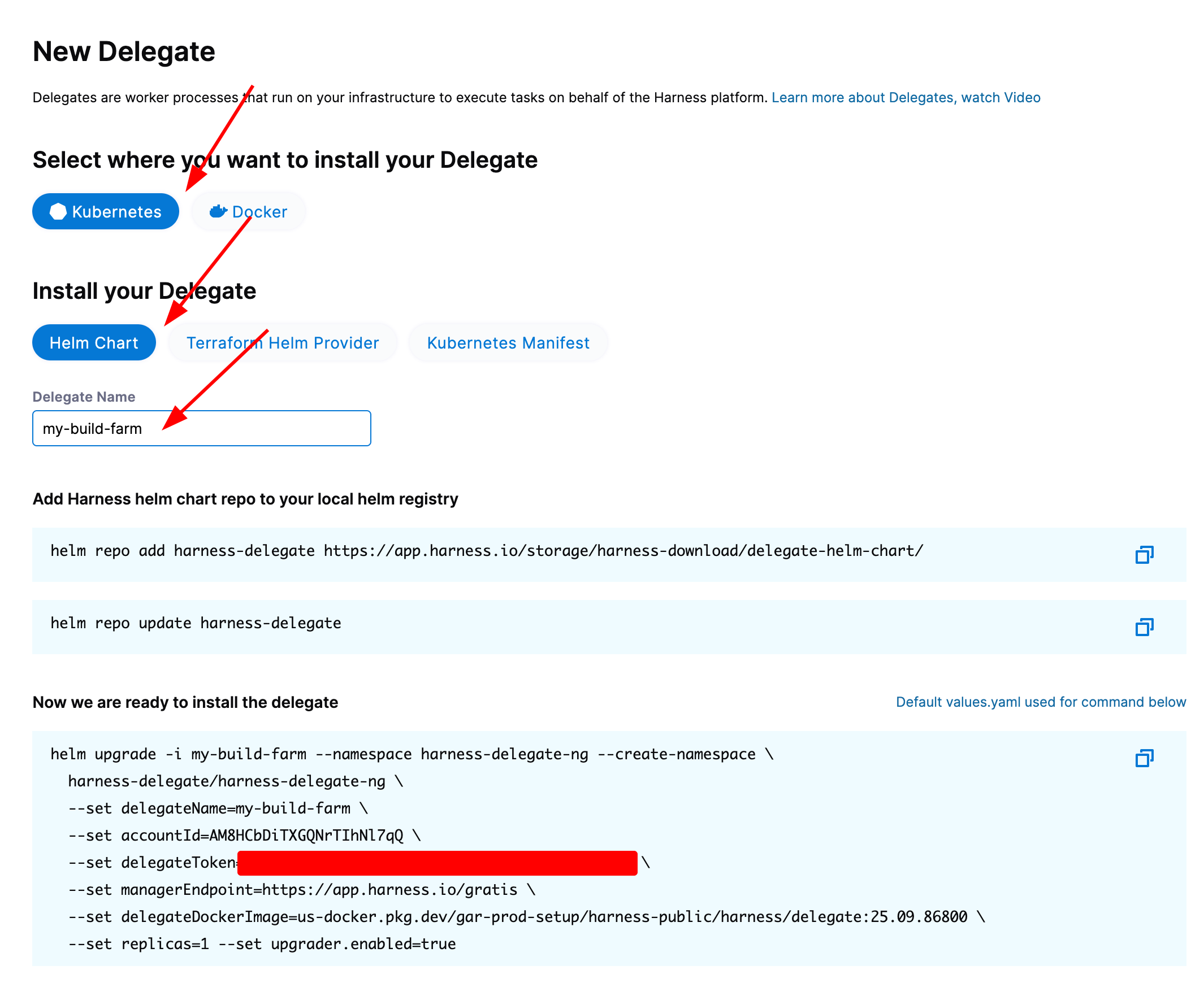 Be sure to set the name of the delegate something that identifies it easily, making it the same as the name of your cluster is a good standard.