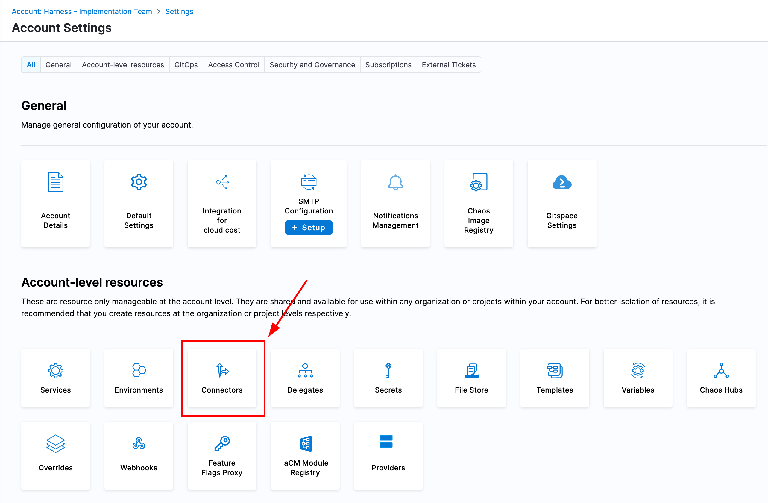 Once again navigate to your Harness account settings and select "Connectors". Then, create a new connector for Kubernetes and create the connector with the same name as the cluster name where the delegate was deployed. For authentication, we will inherit authentication from a Harness Delegate and then select the Harness Delegate we deployed previously.