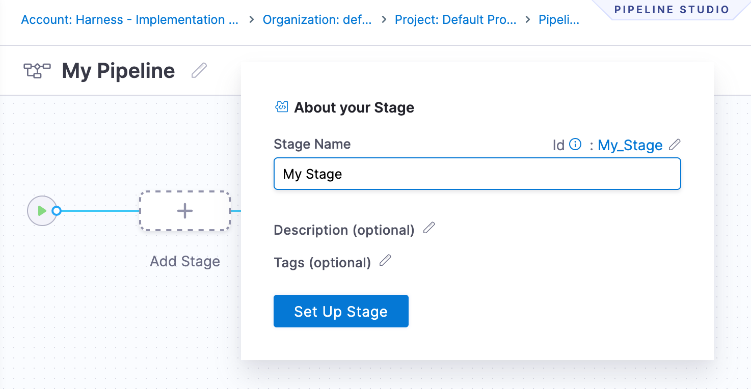 Navigate to a Harness project and create a new pipeline. Create a stage of custom type and select the execution tab.