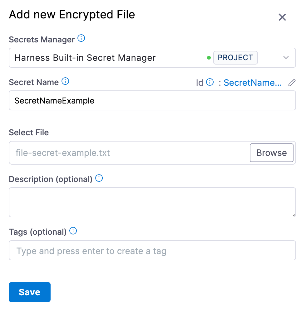 • Secret created at the project scope, use: <+secrets.getValue("FILE_SECRET_ID")>