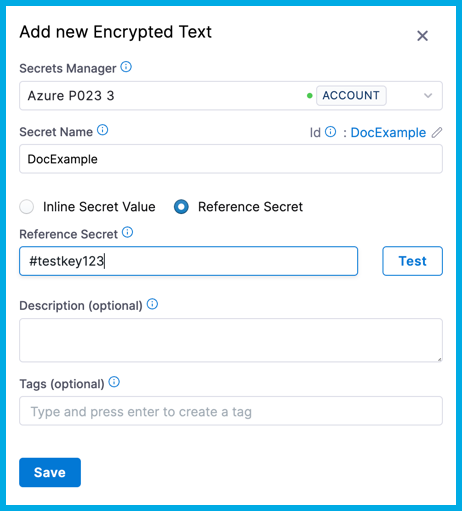 - Reference Secret: Enter the name of the existing secret in your Secret Manager that you want the Reference Secret to refer to, and then select Test to test the reference path. You can reference existing secrets in Azure Key Vault, Hashicorp Vault, AWS Secrets Manager, or GCP Secrets Manager.