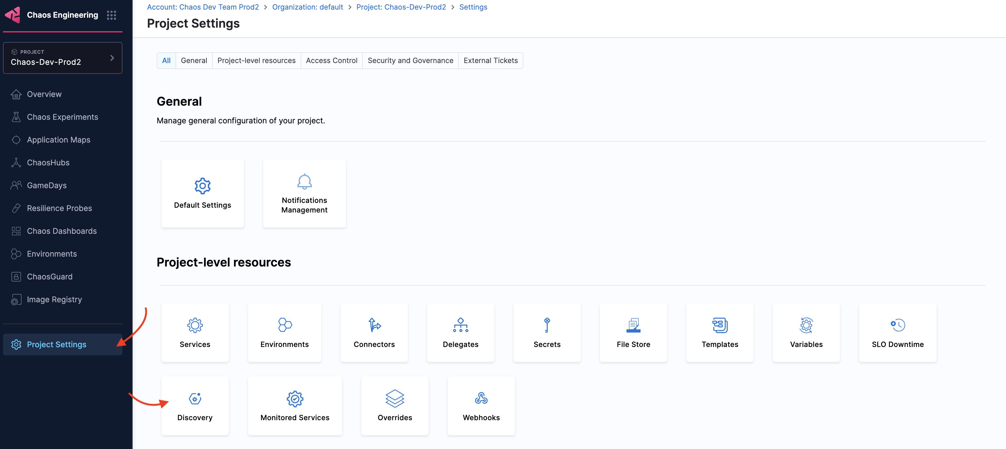 Navigate to Project Settings and select Discovery.