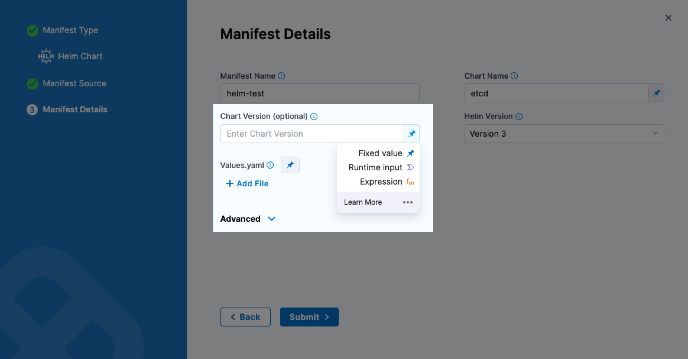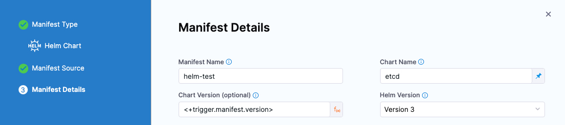 • Use the expression <+trigger.manifest.version> to have the new chart version that initiated the Trigger passed in as the version to deploy.