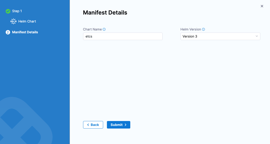 4. In Manifest Details, enter the name of the Helm chart to listen on in Chart Name. For example, nginx or etcd.