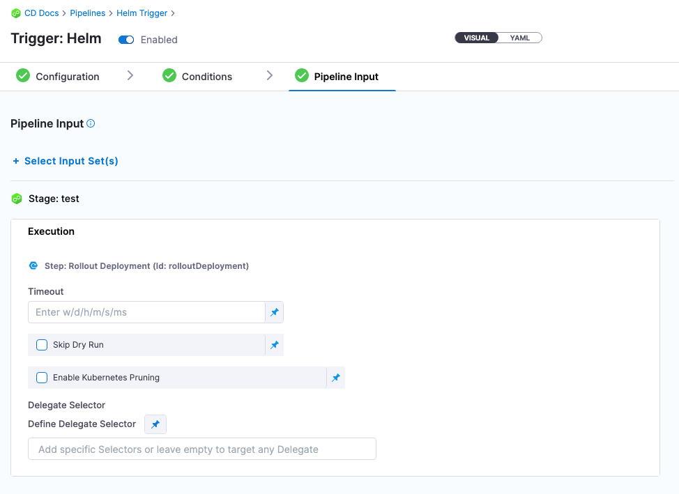 If your pipeline uses runtime inputs or input sets, you can select the inputs to use when the trigger executes the Pipeline.