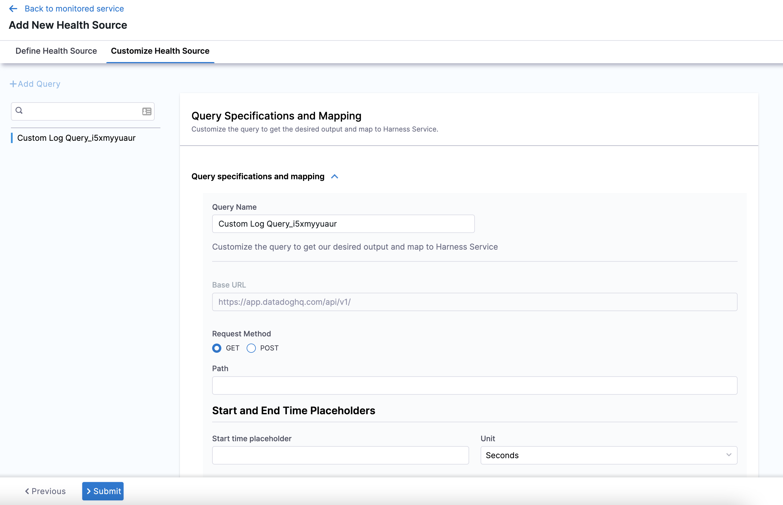 1. In Start time placeholder, enter the start time placeholder in the metric path.
