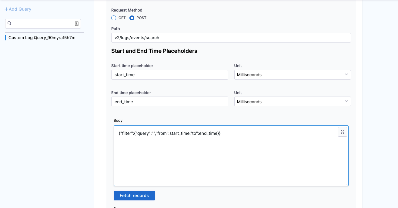 7. In Body, enter the request body. For example,{"filter":{"query":","from":start_time,"to":end_time}}.