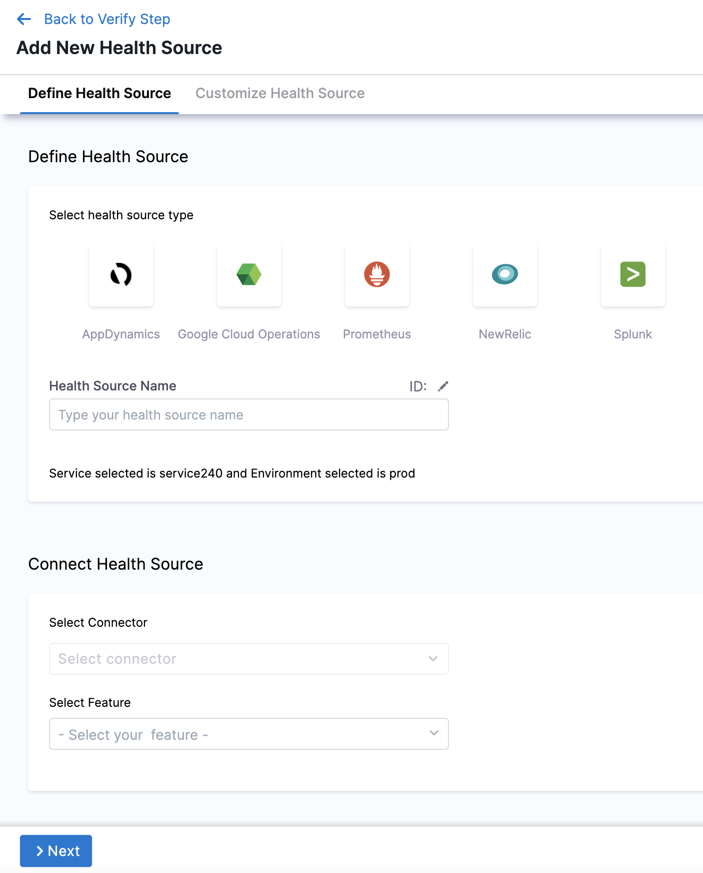10. Click Next. The Customize Health Source settings appear. The subsequent settings in Customize Health Source depend on the Health Source Type you selected. You can customize the metrics to map the Harness Service to the monitored environment.
