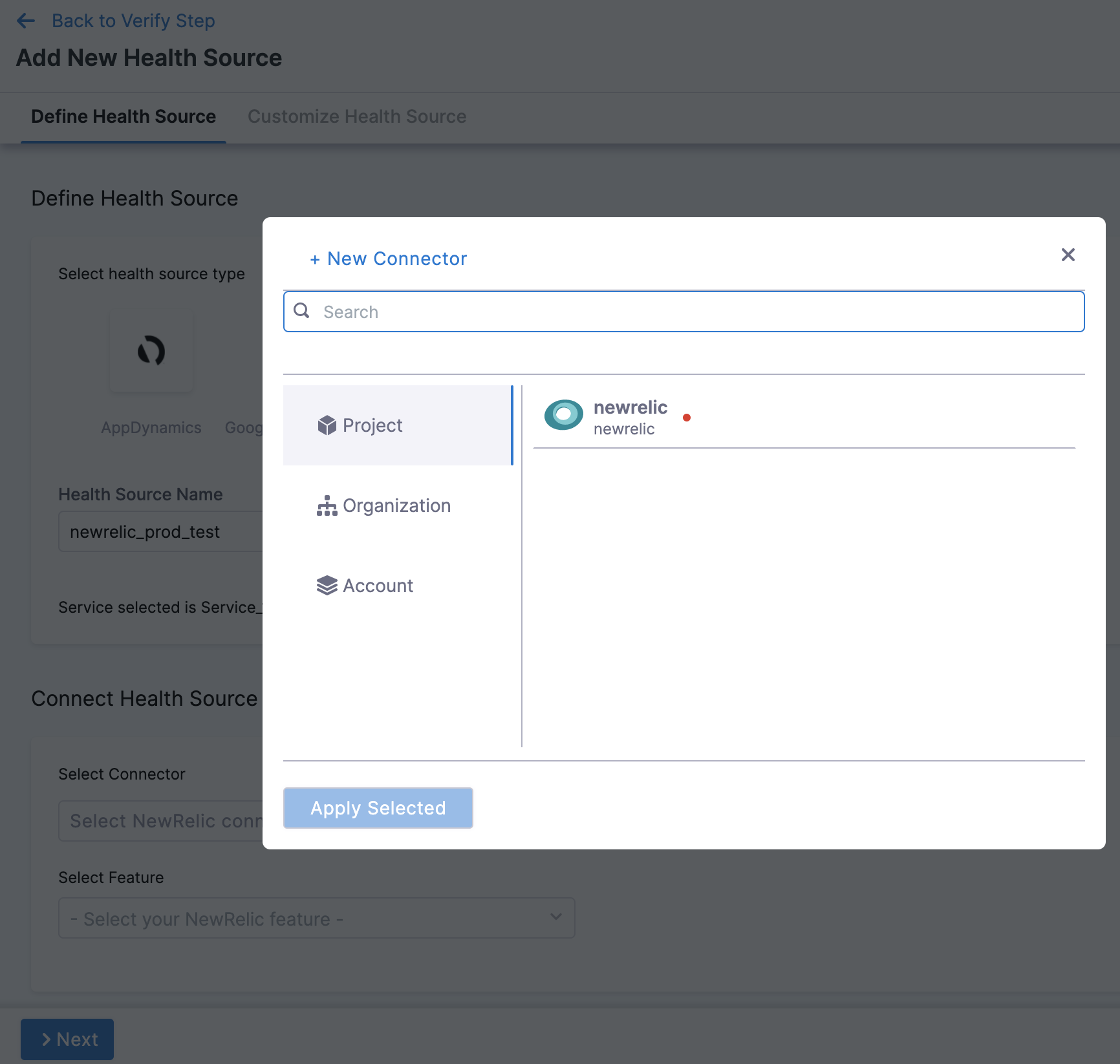 8. Click Apply Selected. The Connector is added to the Health Source.