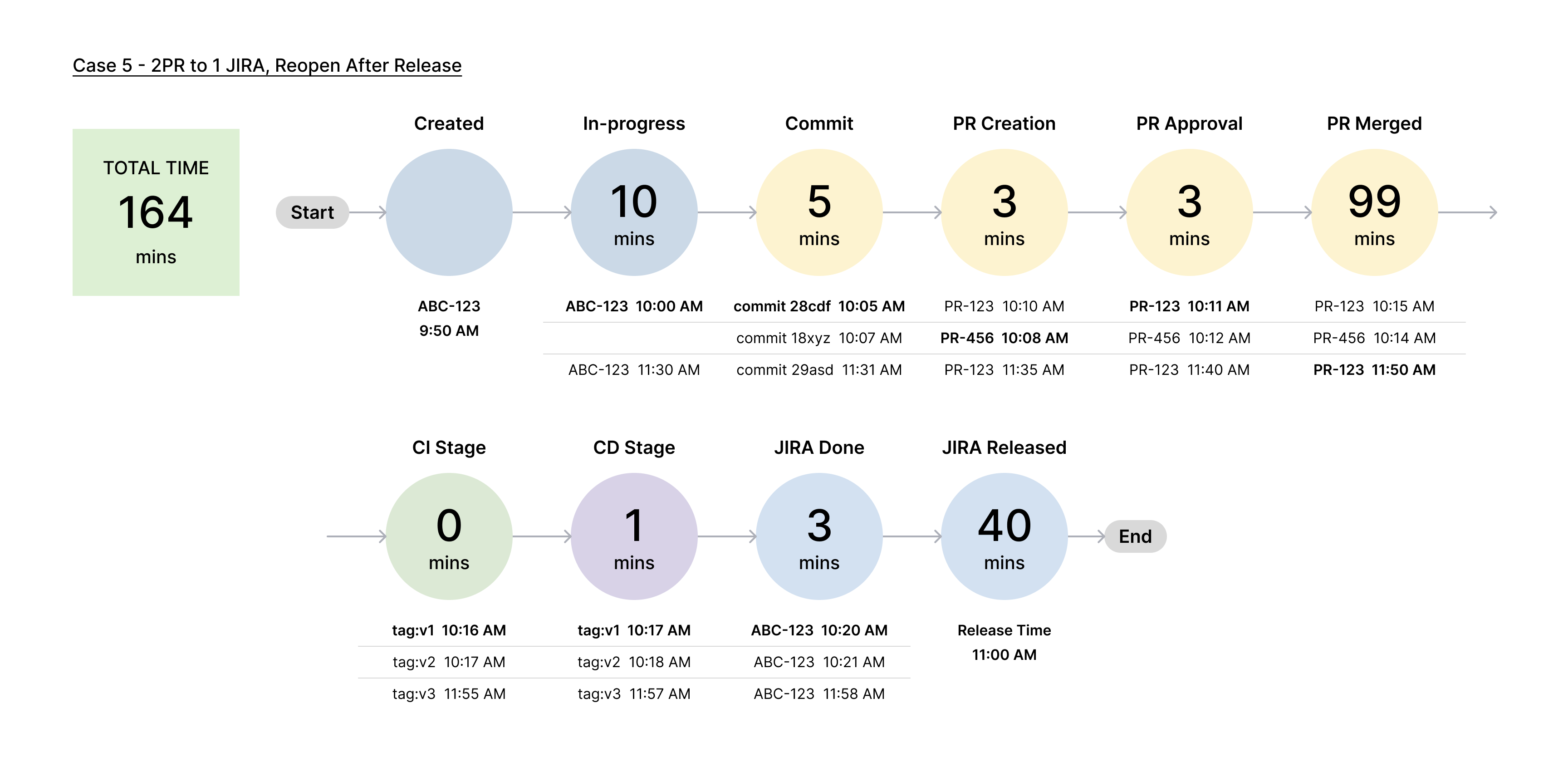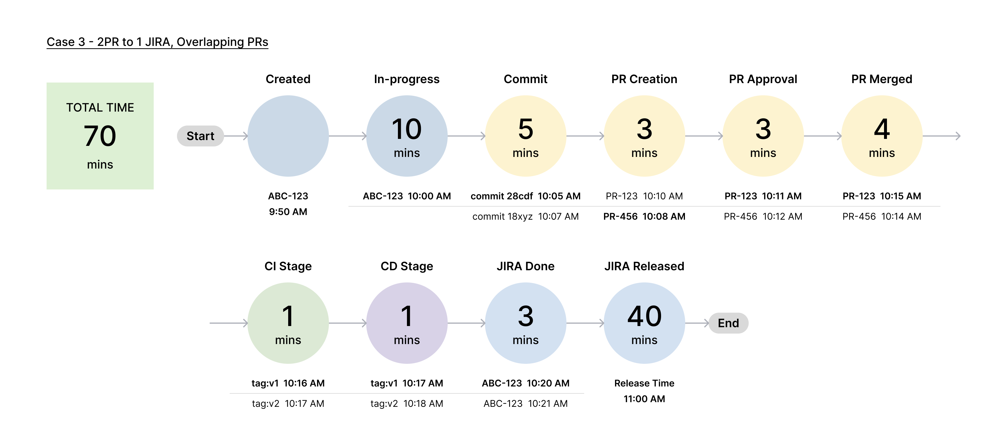 | Last Pull Request Merge Time | The time taken to merge the last (second) pull request after it is approved. | Last PR Merged Time - First PR Approval Time | 10:50 AM - 10:11 AM = 39 minutes |
