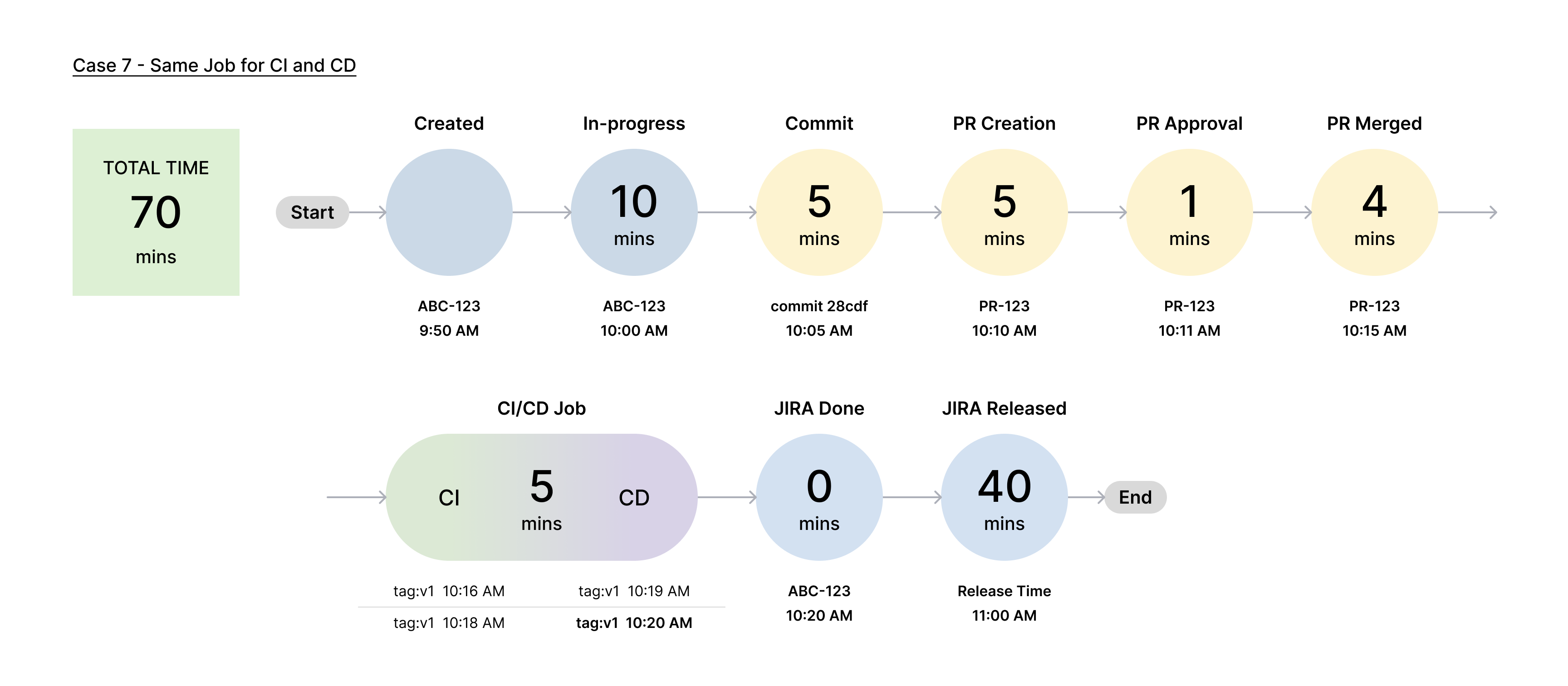 In this case, the First Continuous Integration Time and First Continuous Deployment Time stages represent the separate times taken for the CI and CD processes, respectively, as they are handled by different jobs.