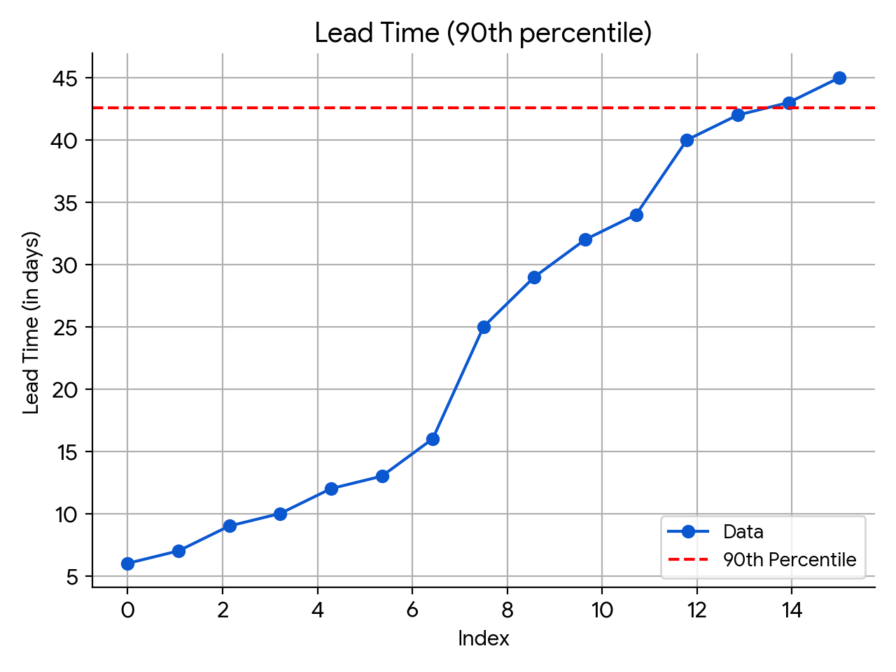 The 95th percentile lead time is the duration within which 95% of tasks or tickets are completed, representing an upper bound for typical completion times while excluding the most extreme delays. The calculation of the 95th percentile lead time follows the same steps as the 90th percentile, with the only difference being the percentile value used.