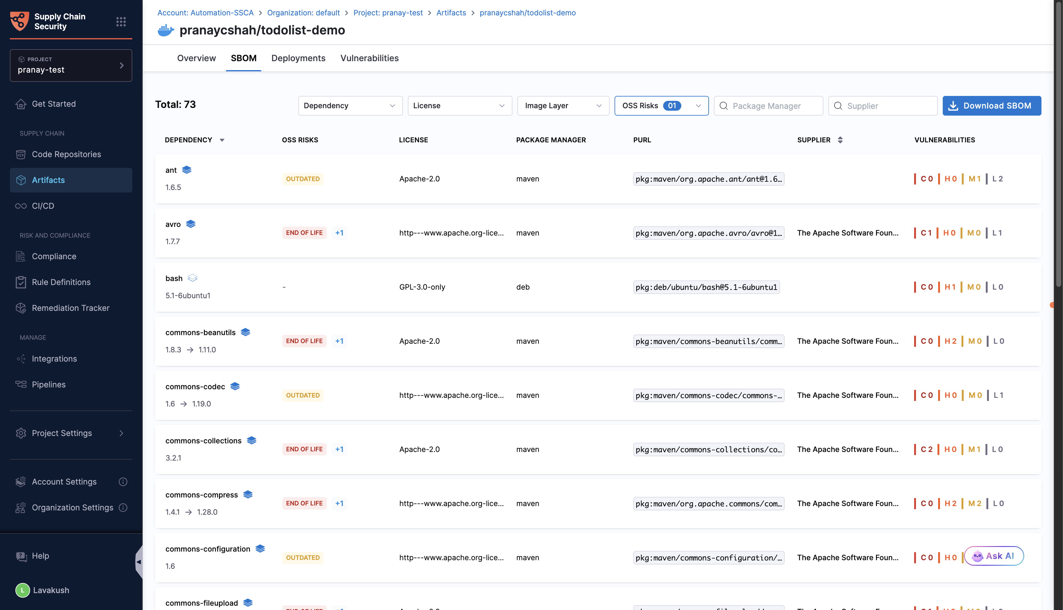 We set the refresh interval for OSS component data to every 2 days. After you run the SBOM Orchestration step, the data is updated asynchronously within 5 – 10 minutes.