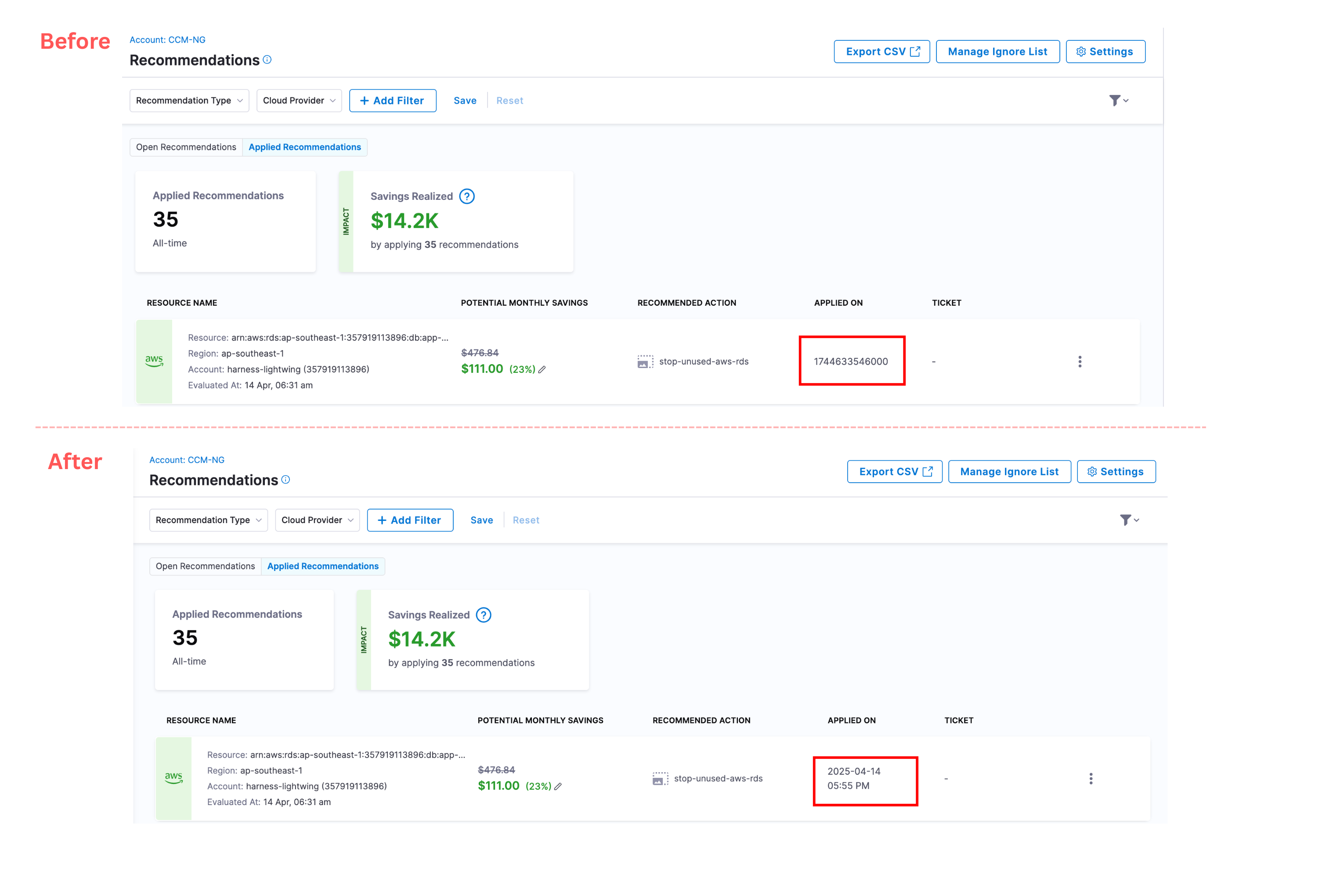 CSV Export for Anomalies: We’ve added support for CSV export in Anomalies, similar to Recommendations. Users can now export detailed anomaly data including Anomaly Link, Start Date, End Date, Duration (Days), Criticality, Resource Name, Resource Info, Cloud Provider, Total Spend, Expected Amount, Anomalous Spend, Anomalous Spend Percentage, Status, Status Updated At, Status Updated By, and Ongoing Anomaly. [CCM-27889]